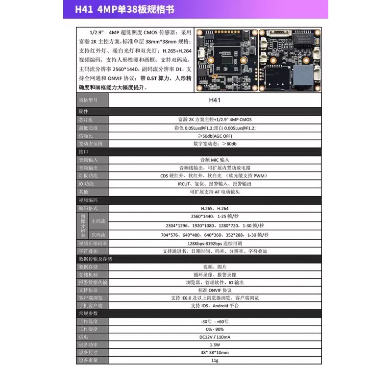 Capteur CMOS 4MP 1/2.9" à ultra-basse luminosité ; utilise la solution principale Fullhan 2K. Format standard monocarte 38mm*38mm. Prend en charge les leds infrarouges, la lumière blanche chaude et la double lumière. Encodage vidéo H.265+/H.264. Supporte la détection humaine et le traçage (encadrement). Supporte le double flux. Résolution principale : 2560*1440, flux secondaire : D1. Supporte le protocole ONVIF. Puissance de calcul de 0.5T intégrée, améliorant considérablement la précision de la reconnaissance humaine.
