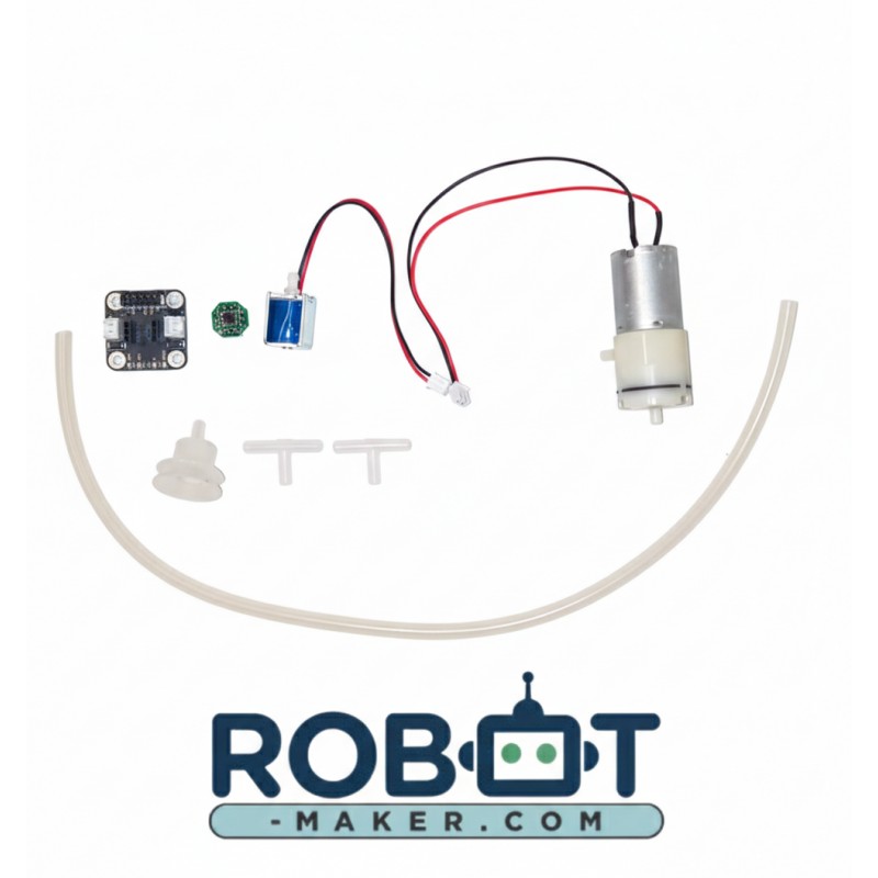 Le kit de préhension pneumatique avec capteur est un ensemble complet permettant de manipuler des objets à l'aide d'une ventouse alimentée par une pompe à air et contrôlée par une électrovanne. Grâce au capteur de pression atmosphérique intégré, il est possible de mesurer et d'ajuster la force d'aspiration afin d'optimiser la prise et le relâchement des objets.