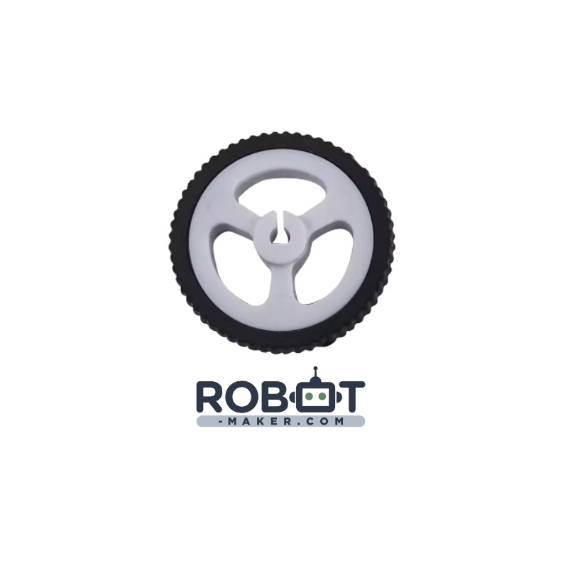 Roue compacte de 32 mm de diamètre, composée d’une jante en plastique blanc et d’un pneu noir cranté.